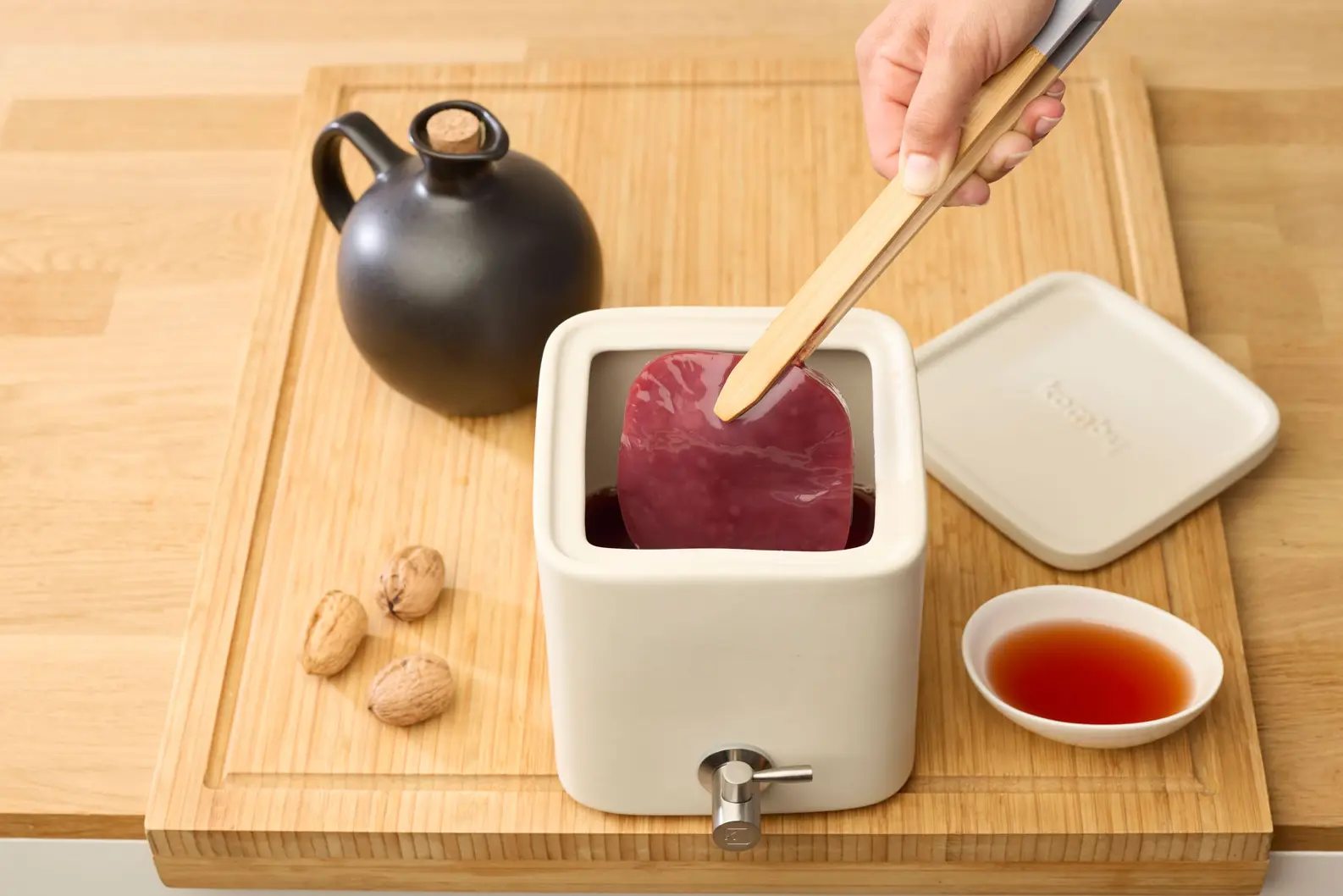 Avec Le Kube en céramique alimentaire et son robinet en inox, transformez un fond de vin en un condiment vivant, plein d’arômes et bon pour la santé, sans gaspillage ni matériel complexe.