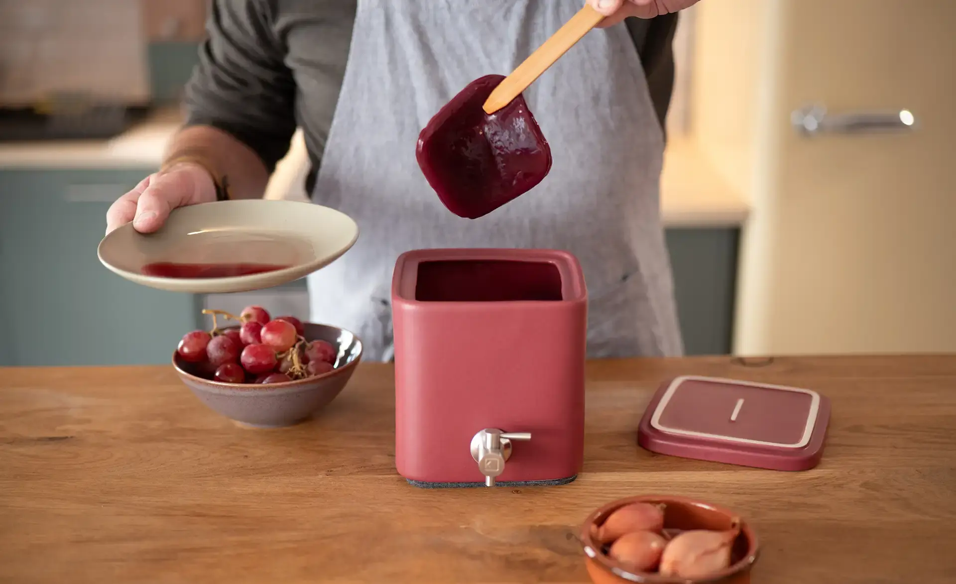 Un contenant en grès, empilable, pratique et sain pour réussir facilement votre vinaigre artisanal.